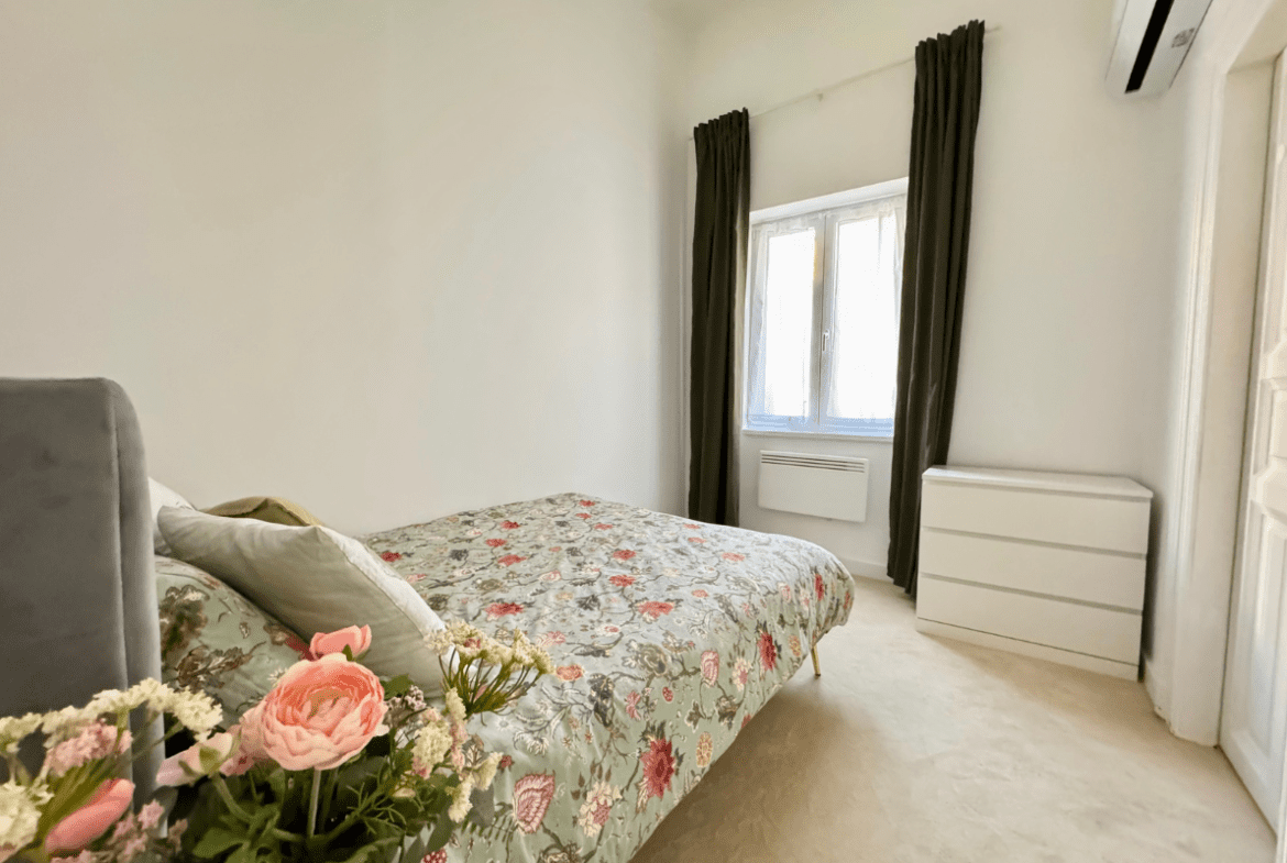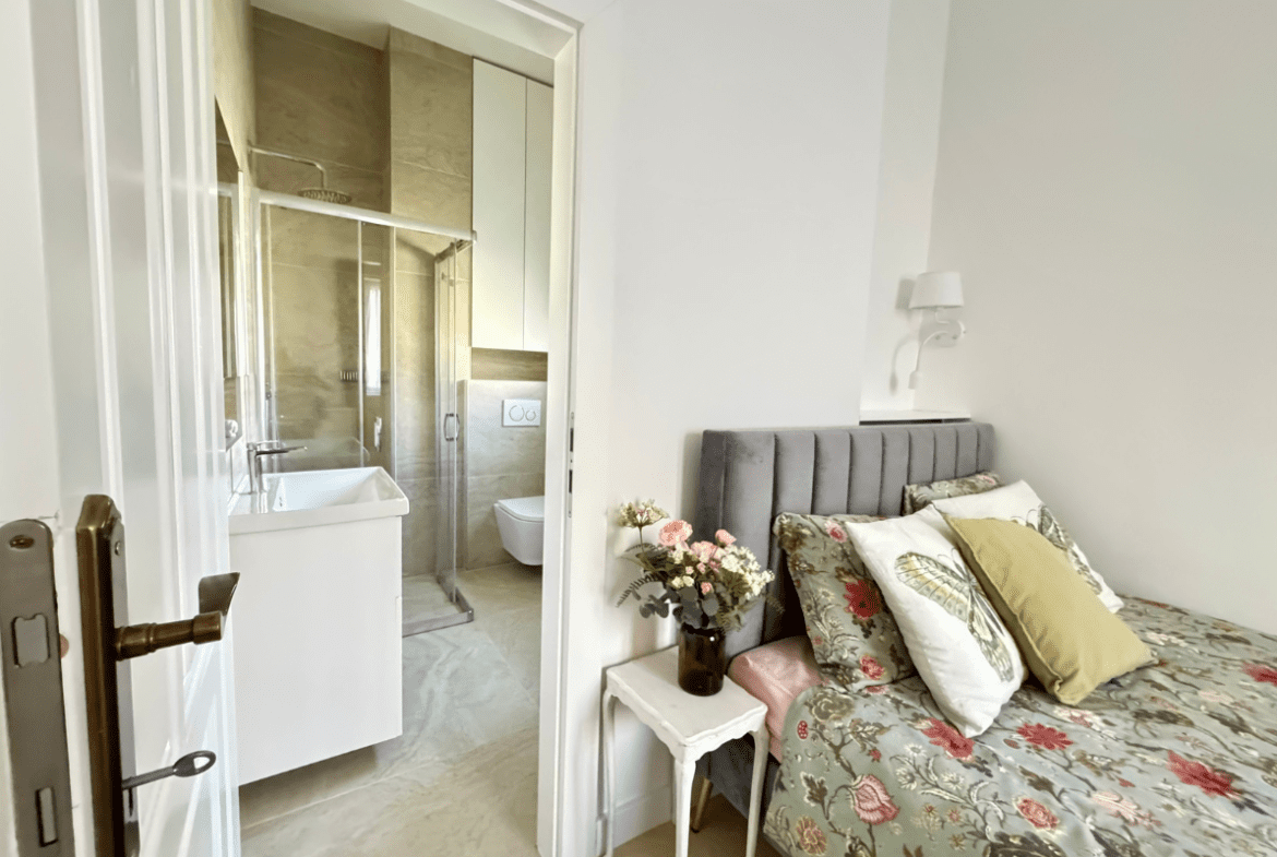 The property features two comfortable bedrooms and two full bathrooms, both equipped with walk-in showers. The bedrooms are exceptionally quiet, facing the building’s inner courtyard, while the living room opens toward the street, offering a charming Paris-style panoramic view. Thanks to its orientation and large windows, the apartment is bright and sunny throughout the day.